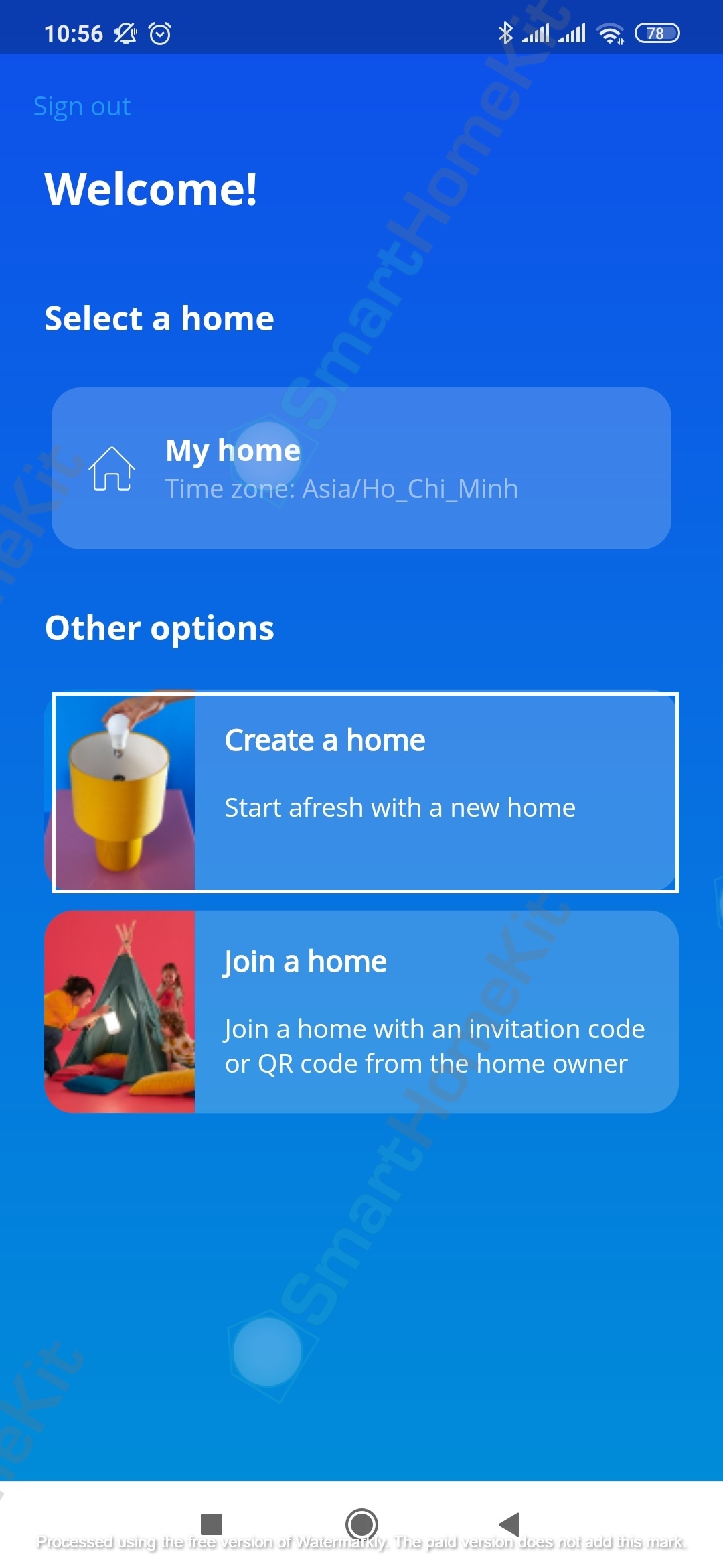 - Mở ứng dụng WiZ → Nhập tên của bạn → Next → Create a new home (hoặc có thể chọn Join an existing home nếu bạn đã từng tạo trước đây)