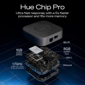 Philips Hue Bridge Pro được trang bị chip Hue Chip Pro mới với tốc độ xử lý cực nhanh 1.7 GHz và CPU lõi tứ Cortex-A35 cho thời gian phản hồi nhanh hơn cùng khả năng chạy các thuật toán phức tạp và các tính năng AI.