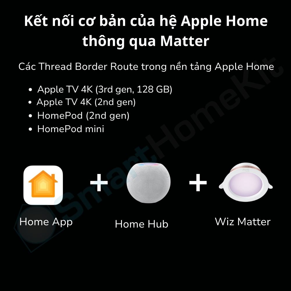 • Để có thể dùng với Apple HomeKit, bạn cần có ít nhất một thiết bị tương thích Matter hoặc Thread Router như: Loa Appple HomePod Mini, Apple Homepod Gen 2, Apple TV,…