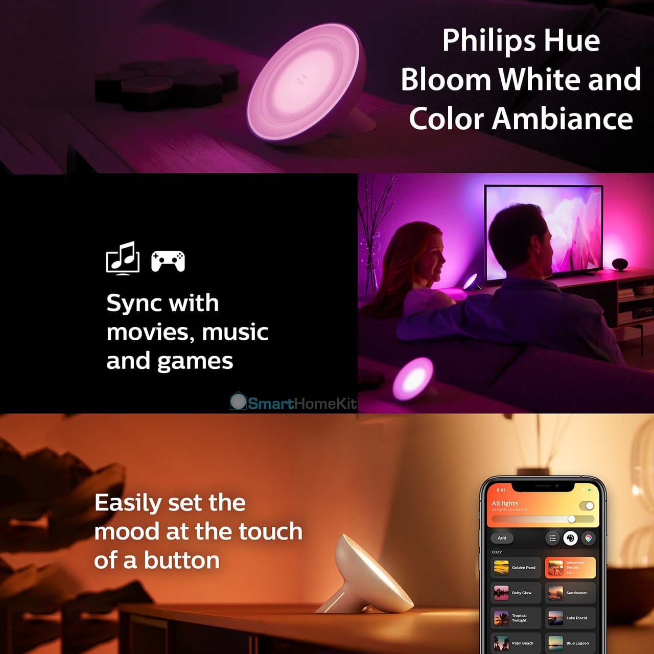 Philips Hue luôn mang tới cho người dùng các trải nghiệm tuyệt vời nhất cho các bóng đèn của mình. Các phiên bản và thiết kế mới lạ của Philips Hue có thể đáp ứng tât cả các nhu cầu thiết kế của người dùng. Đèn Philips Hue Bloom White and Color Ambiance là phiên bản đèn để bàn 16 triệu màu. Có thể sử dụng các chức năng năng nâng cao như: Đồng bộ ánh sáng theo nhạc, màn hình, đi ngủ và thức dậy tự nhiên…