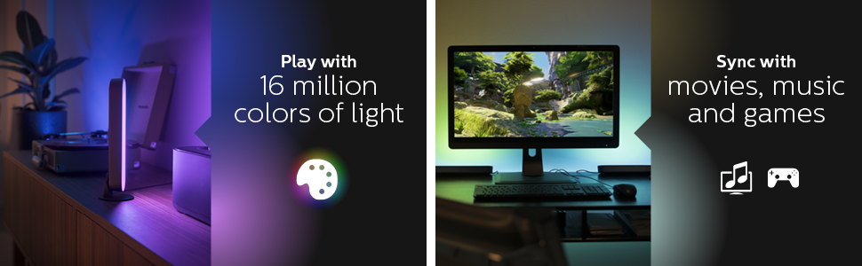 Đắm chìm trong phim, trò chơi hoặc âm nhạc của bạn với sự kỳ diệu của ánh sáng. Với hàng triệu màu sắc để lựa chọn và vô số tùy chọn ánh sáng. Bạn có thể biến bất kỳ phòng khách nào thành rạp chiếu phim riêng tất cả những gì bạn cần mang theo là bỏng ngô! Vói thiết kế linh hoạt, bạn có thể đặt đèn thẳng đứng, nằm ngang ở hai bên PC, TV hoặc bất kì vị trí yêu thích nào. Kết hợp với Philips Hue Bridge là bạn có thể đồng bộ tất cả các nội dung từ màn hình máy tính tới đèn một cách sống động và chân thực nhất.